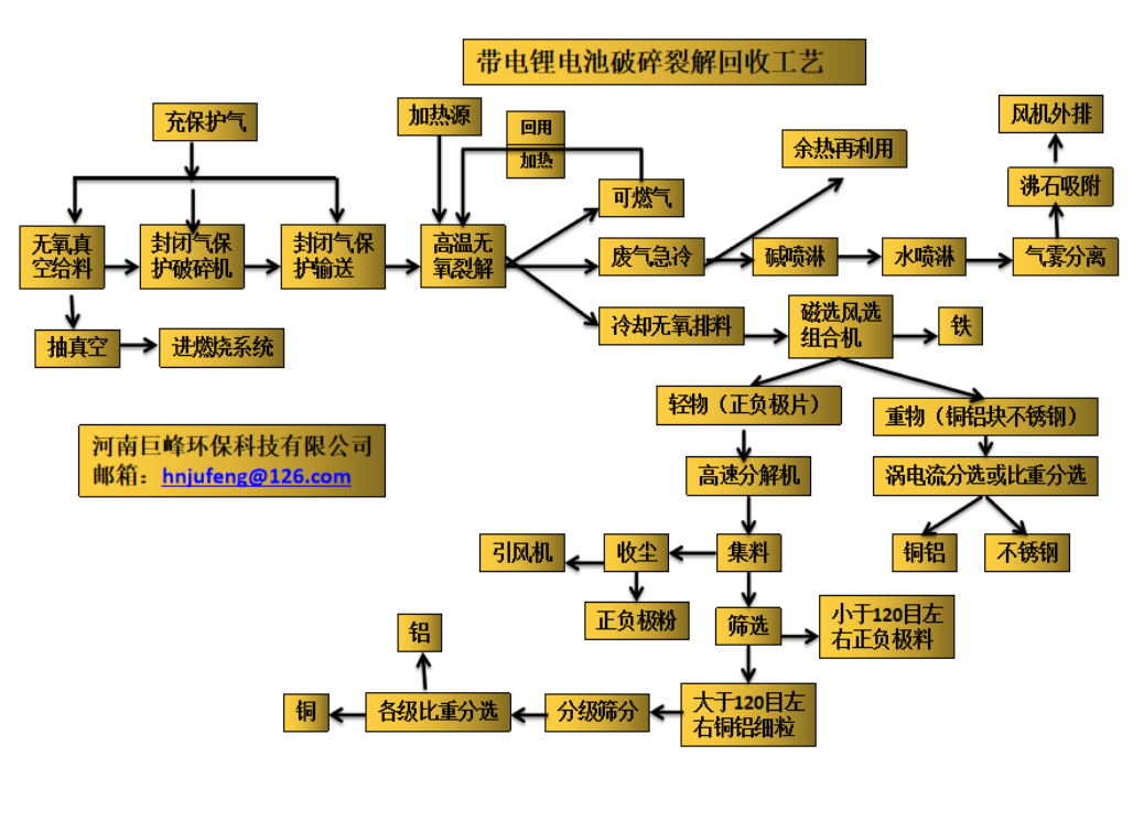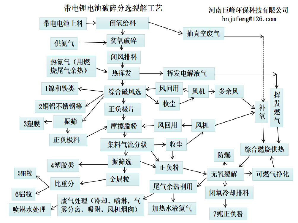 帶電鋰電進貧氧破碎,送至惰性保護氣輸送,把破碎后的物料直接進無氧裂解系統,帶電鋰電加熱在爐內放電發熱電能二次利用,同時對電解質、塑膜、塑膠和粘合劑等有機物進行裂解,裂解產生的可燃氣凈化后對爐供熱,裂解后物料冷卻磁選風選后把鐵、鎳、鋁塊、銅塊、不銹鋼分選出,再把分選出裂解極片經摩擦脫粉篩選分級,進行把極粉和金屬顆粒分離,金屬顆粒再經過分級比重分選進行銅鋁分離。燃燒尾氣經過冷卻噴淋,水汽分離和吸附進行達標排放.