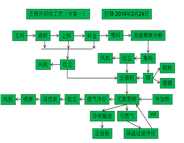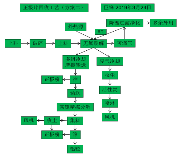 廢舊鋰電池里的正極片經(jīng)破進(jìn)無氧裂解爐,可燃?xì)鈨艋赜茫瑥U氣處理排放。裂解極片經(jīng)篩選、高速摩擦、除塵集料等工序,得較純正極粉和鋁粒。