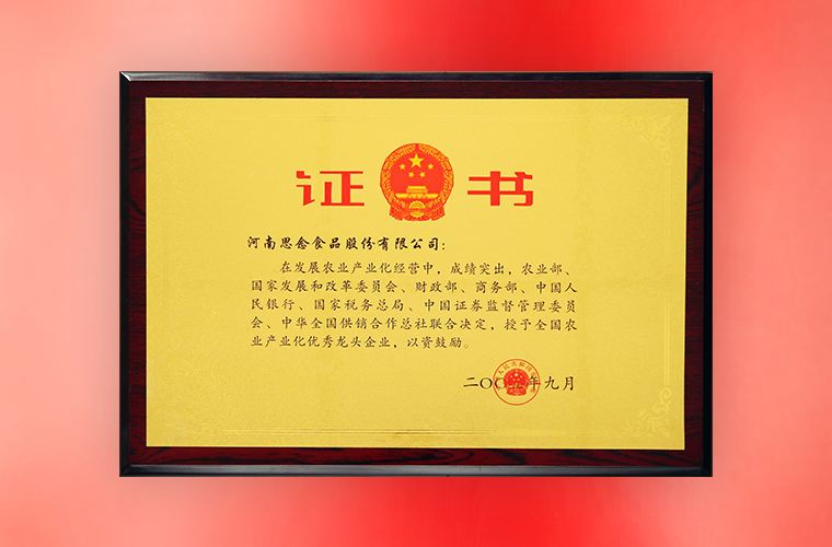 9月,思念食品被國家八部委授予“全國農業產業化優秀龍頭企業”榮譽稱號。