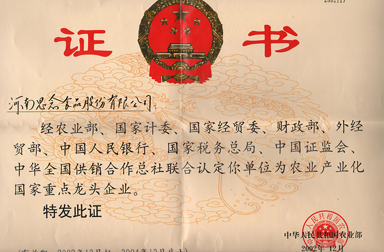 3月,思念食品被國家八部委聯合審定為“農業產業化國家重點龍頭企業” 。