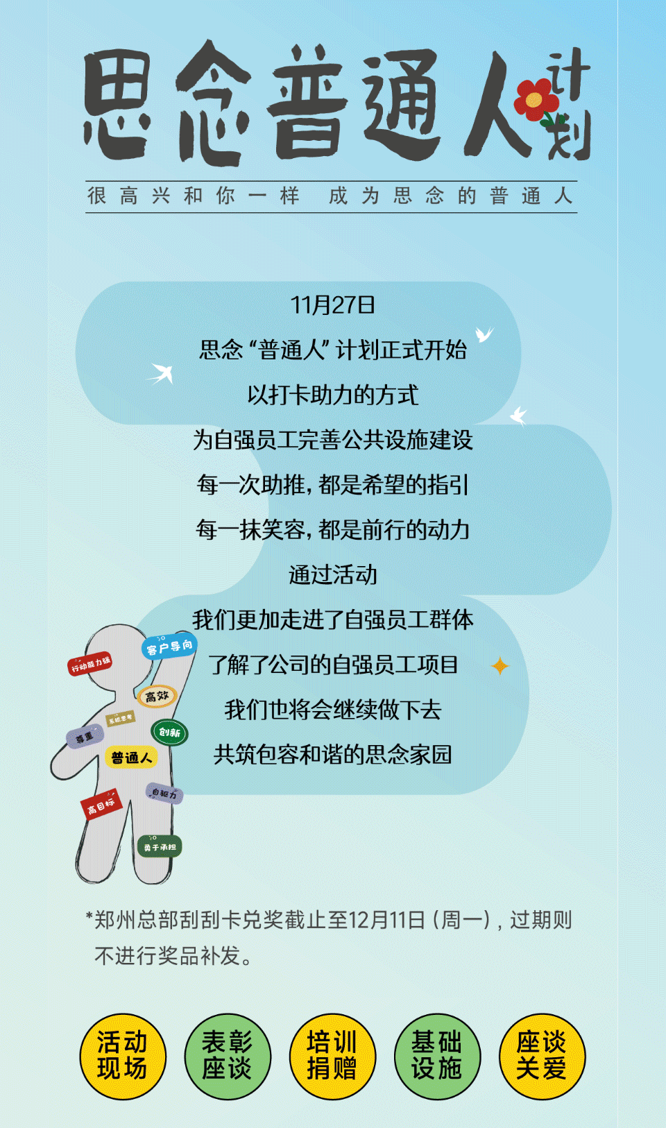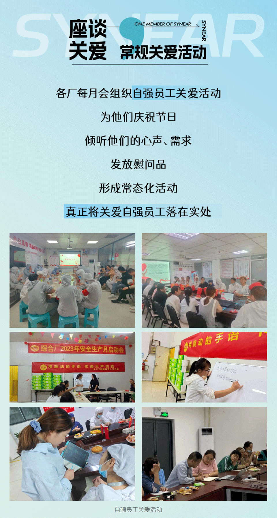為進一步傳播針對自強員工的“尊重”文化,引導全體思念人積極踐行“尊重”文化,展現公司對自強員工的關懷與支持,在第32個國際殘疾人日來臨之際,公共事務部特組織面向公司各生產基地的自強員工關愛活動,號召全體思念人為他們營造無障礙的工作和生活環境,助推他們穩崗就業,在思念實現自我價值,和大家一樣成為思念的普通人。